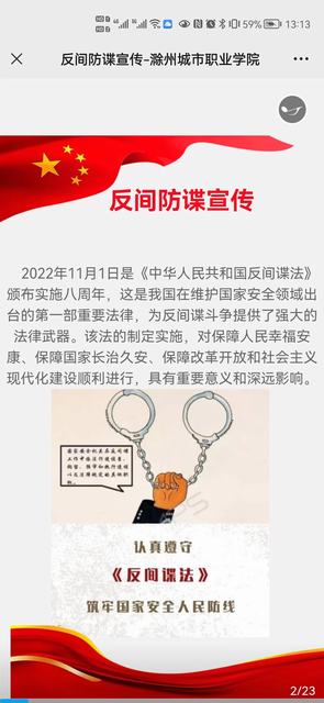 今年11月1日是《中华人民共和国反间谍法》颁布实施8周年,为进一步推进国家安全人民防线宣传教育工作,切实增强广大师生的国家安全意识,学校积极开展师生国家安全宣传教育活动,筑牢国家安全防线。
