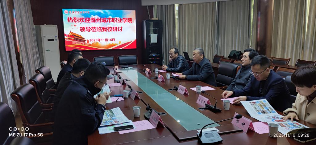 在武汉警官职业学院,施向阳一行受到该校党委委员、副校长潘东升及有关部门负责人的热情接待。在座谈会上,施向阳介绍了学校概况和发展历程,观看了警官职业学院宣传片,并就与武汉伟创聚赢校企合作工作开展了深入交流探讨。座谈会后,施向阳一行实地考察了有关校企合作项目。
