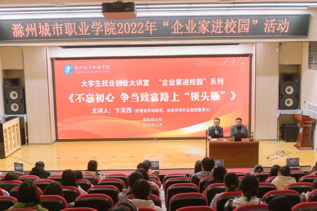 为激发大学生创业热情,提高创新创业能力,促进更高质量就业,11月23日下午,我校在图文中心四楼报告厅举办大学生就业创业大讲堂,开展“企业家进校园”活动。活动邀请2022年安徽省劳动模范、省第十一次党代会代表、省金桥湾农业集团董事长卞泽西宣讲创业故事。来自各学院学生代表近150人聆听了讲座。活动由招生就业处处长朱启来主持。