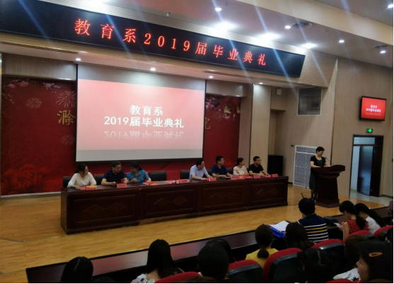 典礼开场,全体成员起立,奏唱国歌。张志华致辞发言,张志华向教育系2019届全体毕业生致以热烈的祝贺,就如何适应社会,结合自己的亲身经历给毕业生们提出了三点建议:一是在今后的生活中遇到困难要有勇气,攻坚克难,砥砺奋进;二是学会不断拓宽视野,认真学习,努力提升和完善自己;三是对待工作要兢兢业业,从小事做起,脚踏实地,一步一个脚印,以求真务实的态度对待工作,才能做有所成。张志华还对毕业生们表达了殷切期望,希望全体毕业生能够牢记“修德立身 精技立业”校训,向优秀校友们看齐,在工作岗位上发光发热,成为城院的优秀传人。 2019届优秀毕业生代表王德安以“感恩母校”为主题上台发言;2017级在校生代表何姝璟上台为学长学姐们送上珍贵的祝福;毕业班班主任代表胡芝玮教师为2019届全体毕业生送上了临别赠言,表达了对全体毕业生的美好祝愿。