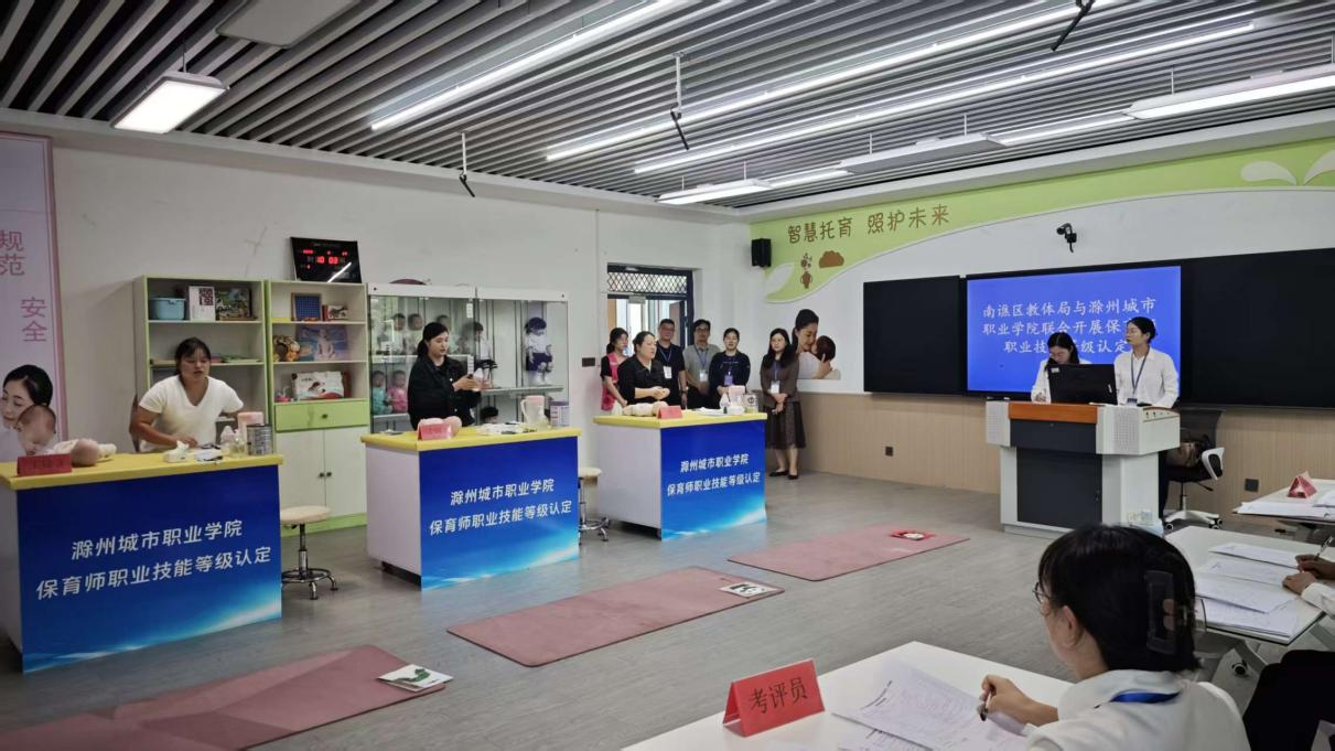 为加强滁州市南谯区职业技能人才培养,筑牢保育师领域人才根基,9月27日,我校与南谯区教体局联合开展保育师职业技能等级认定工作。校党委委员、副校长孙静,滁州市人社局职鉴中心主任姜梦莲到场巡考,继续教育学院院长许梅、副院长孟红军、教育学院副院长刘明辉陪同参加。