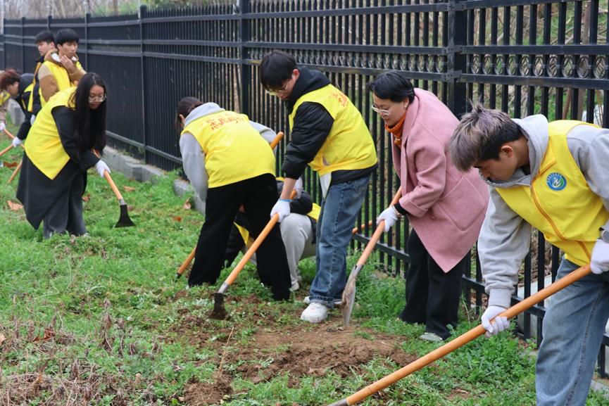 下午两点半,师生们抵达百草园后迅速投入劳作。学生志愿者分工协作,手持工具翻整土地、开沟起垄,小心翼翼地将一粒粒薰衣草种子埋入土壤中。“薰衣草不仅是观赏植物,还具有安神、消炎等药用价值。播种既是劳动,也是学习中医药知识的过程。”医学院党总支书记周慧和同学们介绍道。另一侧,教师们合力挖坑、扶苗、培土、浇水,共同种下20余株树木,分别有桃树、山楂树、海棠树、紫薇树及石楠。