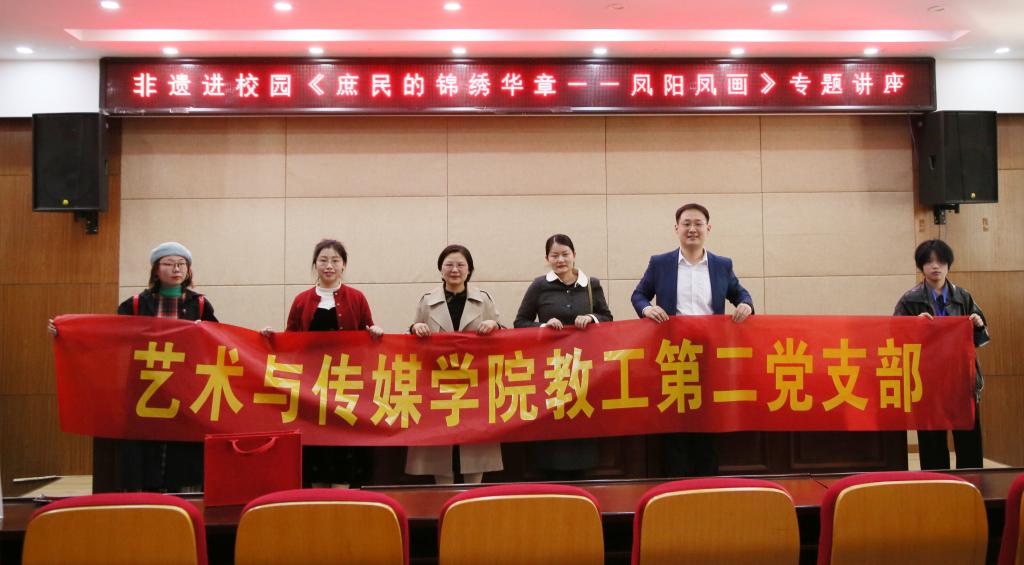 为深入学习贯彻习近平新时代中国特色社会主义思想和党的二十大精神,传承和弘扬中华优秀传统文化,加强党建与非遗传承、美育工作的深度融合。4月2日,我校艺术与传媒学院教工第二党支部赴滁州职业技术学院传媒与设计学院,开展了一场别开生面的“非遗名师进校园”党日活动。本次活动以《庶民的锦绣华章——凤阳凤画》为主题,为师生们带来了一场精彩绝伦的非遗文化盛宴。