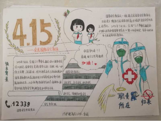19护理高专2班组织同学们集体学习国家安全日的相关知识,章娟、刘淑晴同学更是用纸和笔制作出属于她的宣传海报,展示了一位护理专业大学生心中满载的责任和对医务工作者的敬仰。
