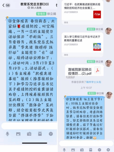 为了使党员教育和党的政治生活不断线、质量不降低,为了充分发挥基层党组织战斗堡垒作用和党员先锋模范作用,全力以赴做好教育系疫情防控和教学、科研、学生管理等工作,教育系党总支坚持不聚集“云开会”原则,充分运用“学习强国”平台学习资源,依托QQ群、微信群和钉钉视频会议于3月17日至19日积极组织开展“学先锋 做模范 防疫情”三月线上主题党日活动,以实际行动让党旗在防控疫情斗争中高高飘扬。