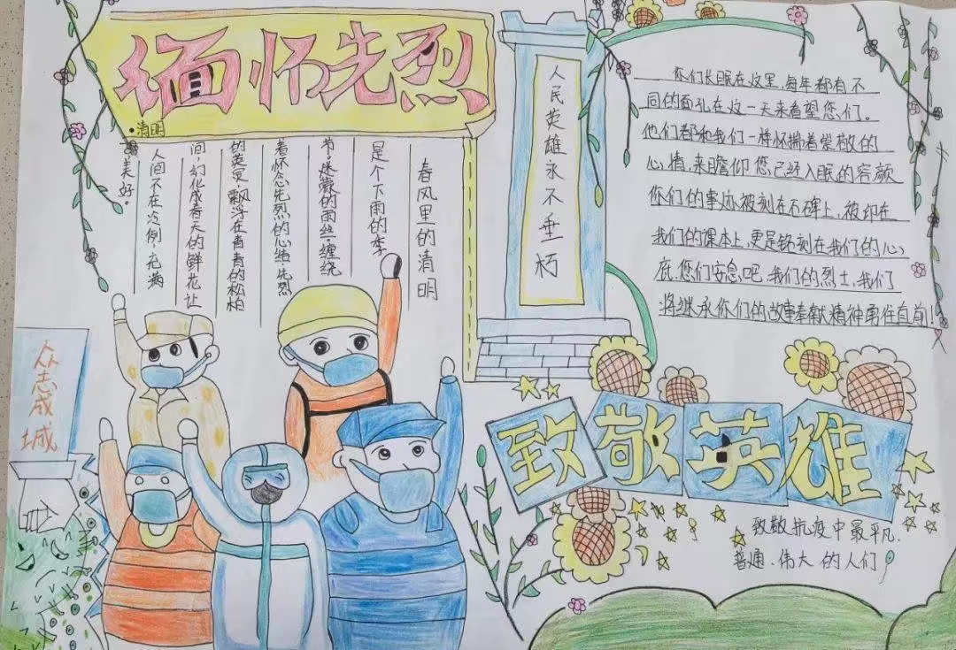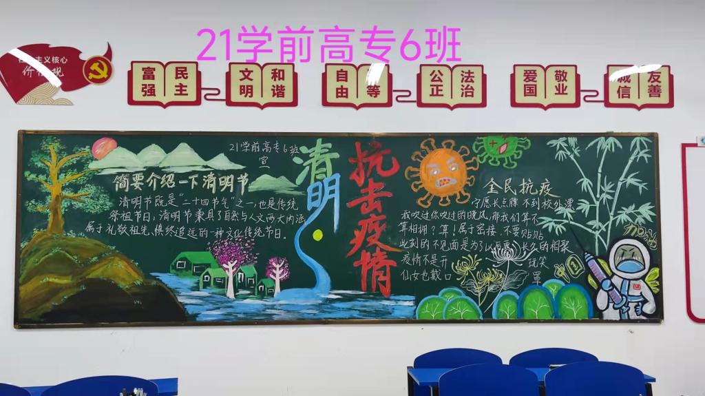 为做好疫情防控和缅怀革命先烈,教育学院团总支组织班级开展抗疫与清明的黑板报评比,通过这一方式让每一名学生在慎终追远、缅怀先辈的情怀中认知传统、尊重传统、继承传统。