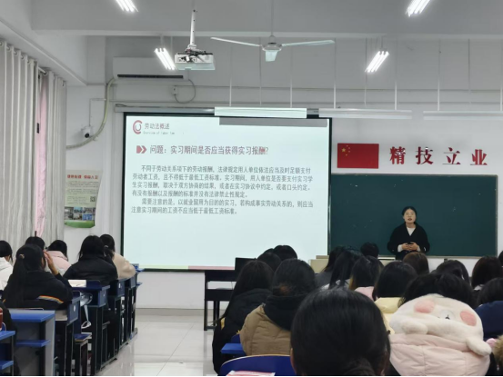 高立萍以“就业之路 与法同行”为主题,首先进行了劳动法的概述,引导学生厘清“劳动关系”与“劳务关系”之间的区别;其次讲述了劳动者的主要权利,如平等就业权利、取得劳动报酬的权利、休息休假的权利等;最后介绍了劳动者依法维权的具体途径,详细介绍了仲裁流程,深化了对就业维权的认识。