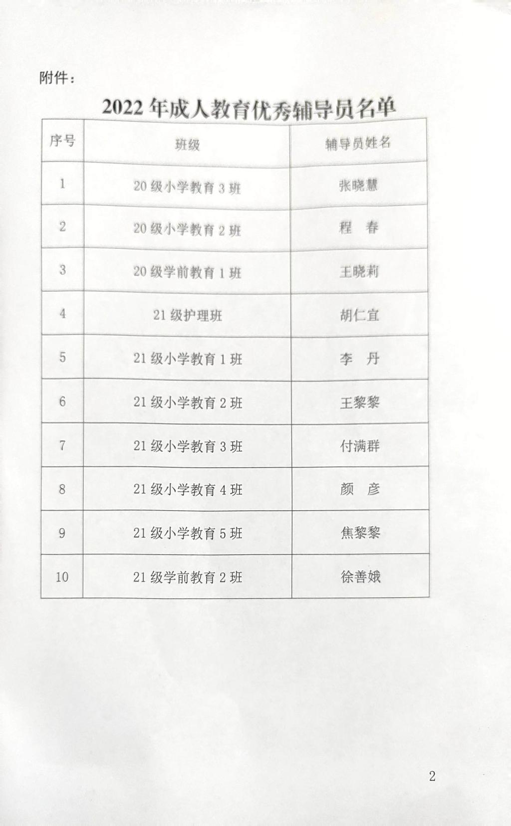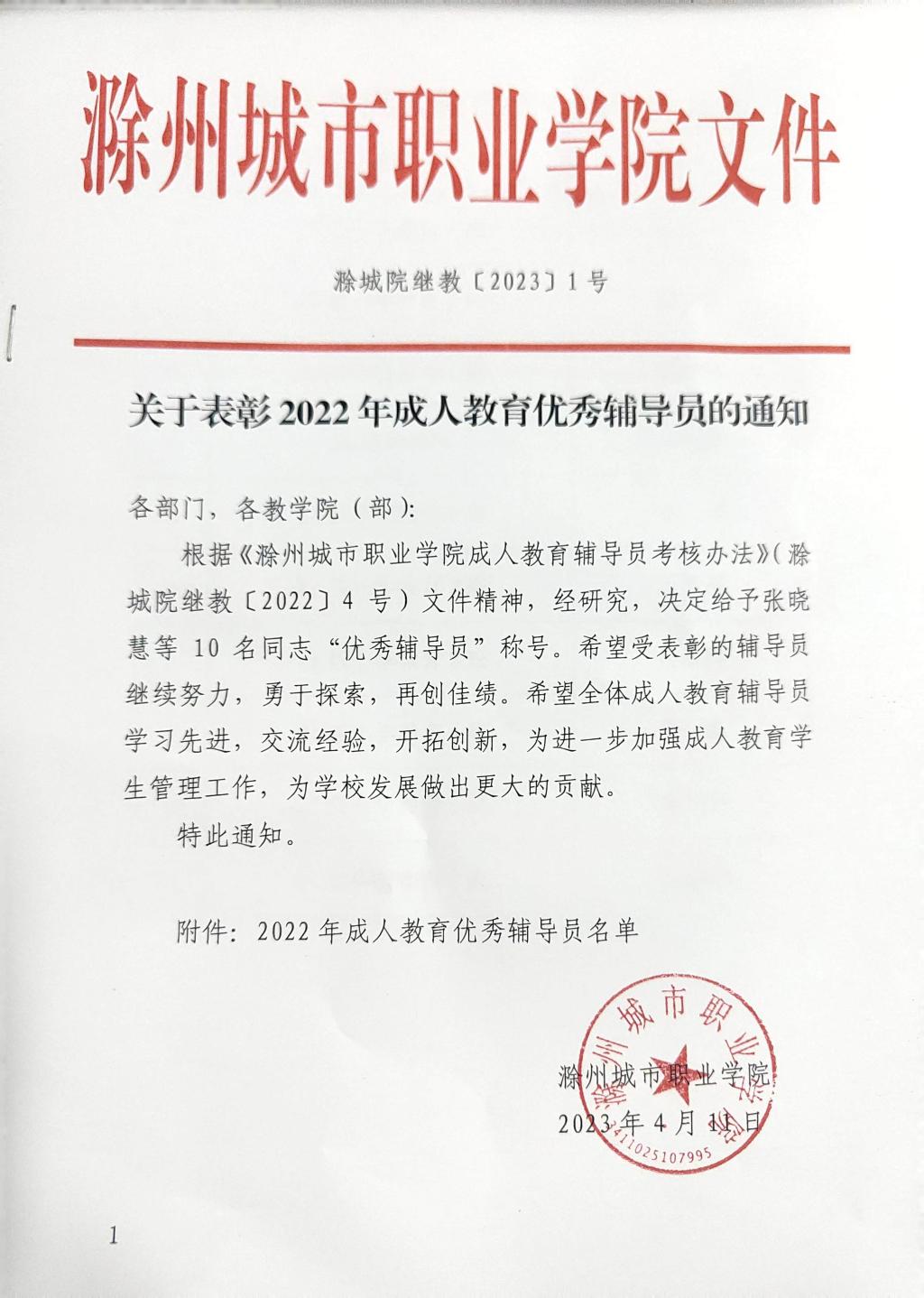 关于表彰我校成人教育2022年优秀辅导员的通知