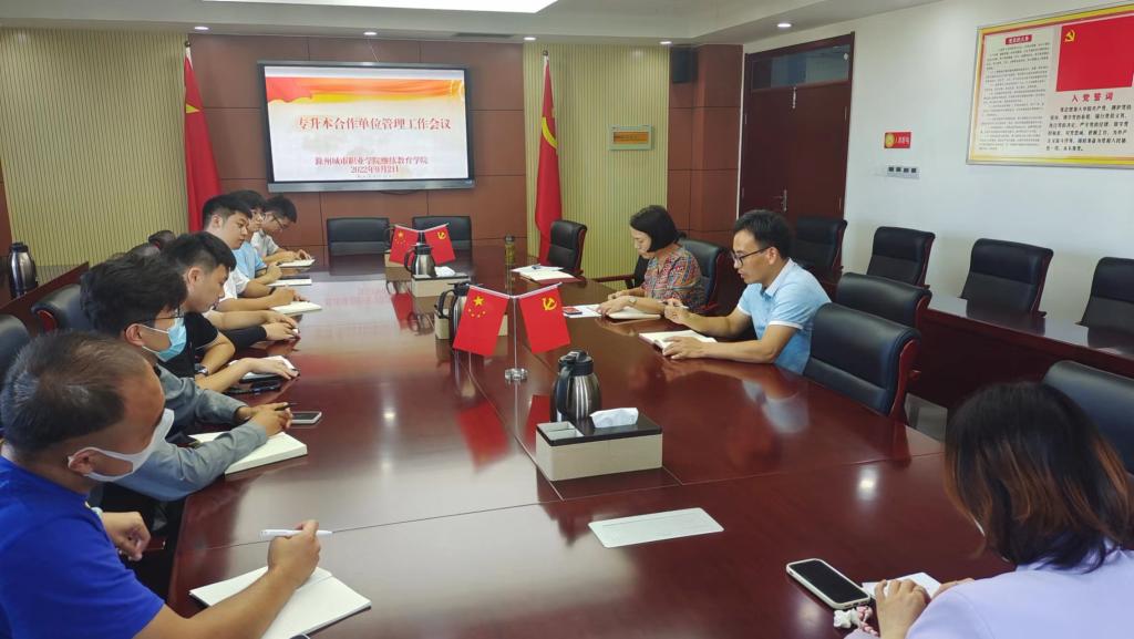 为强化专升本合作单位管理工作,规范专升本办学行为,9月2日下午,继续教育学院在第一会议室召开专升本合作单位管理工作会议,院长许梅、专升本工作负责人孟红军、蒋涛参加会议。