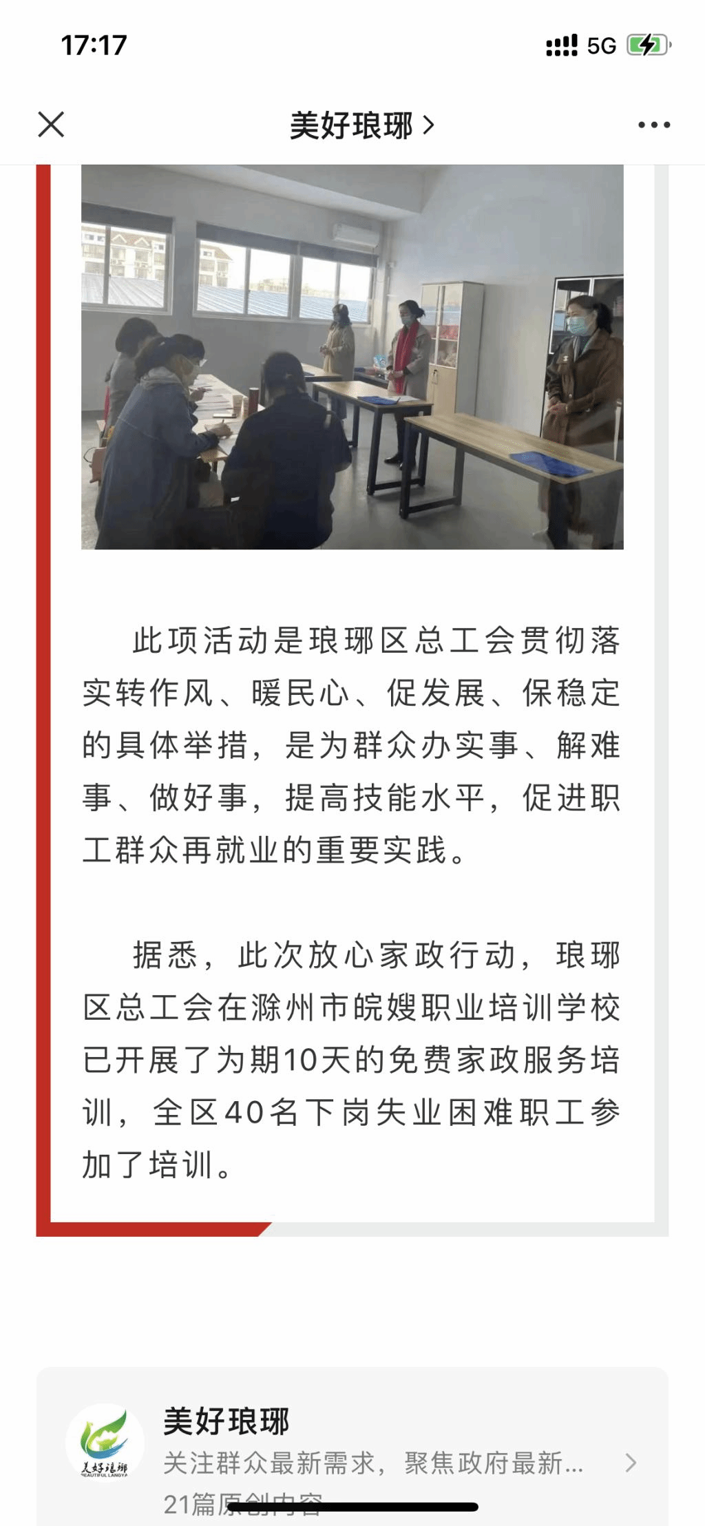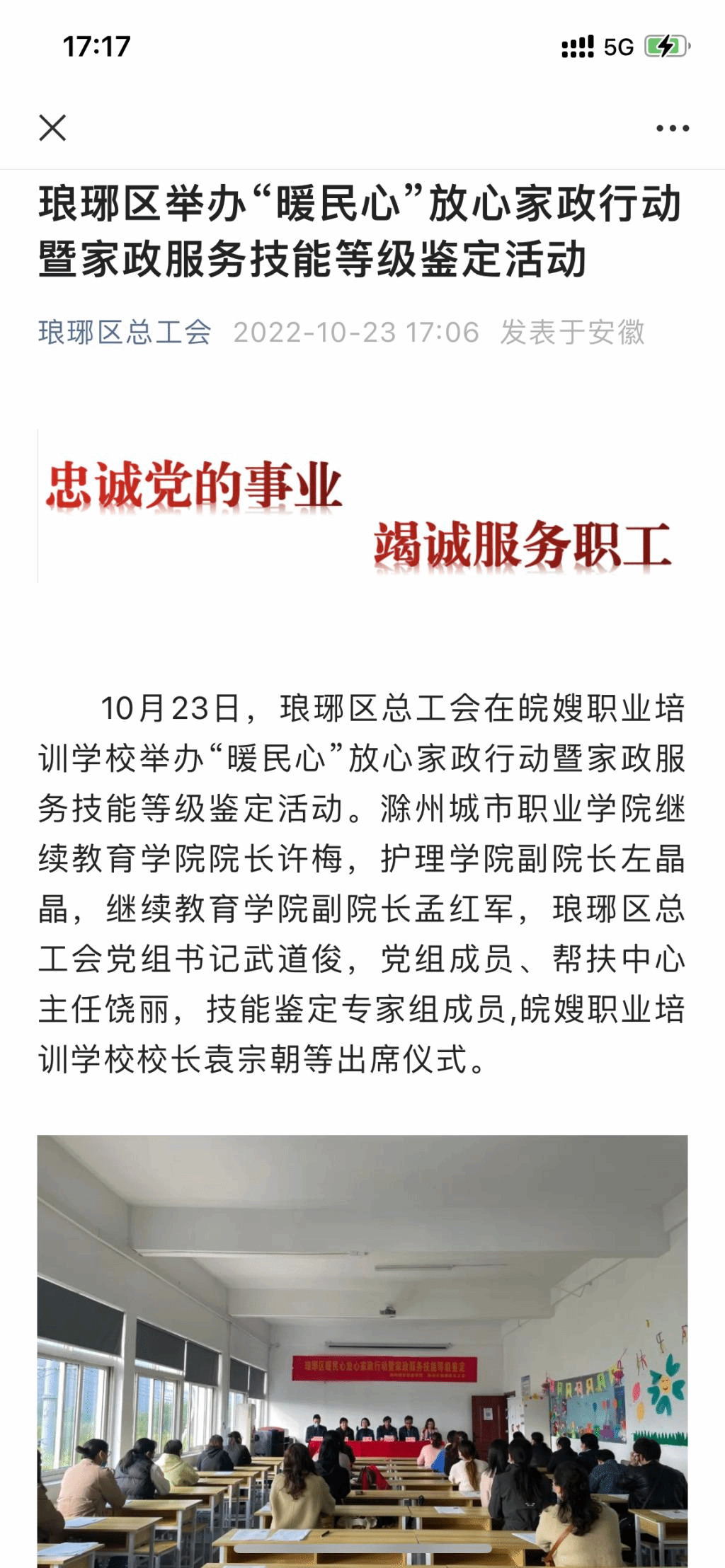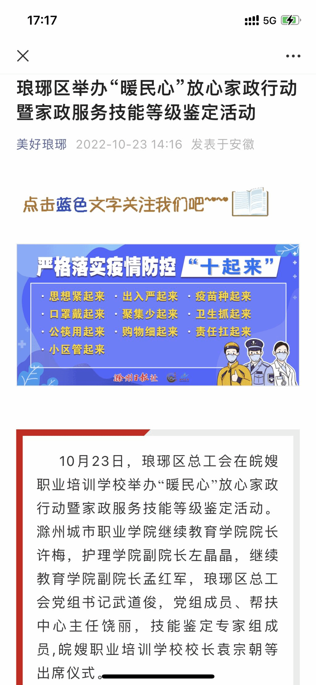 10月23日,我校与琅琊区总工会联合举办“暖民心”放心家政行动暨家政服务技能等级鉴定活动。“美好琅琊”、“琅琊区总工会”对此进行宣传报道: