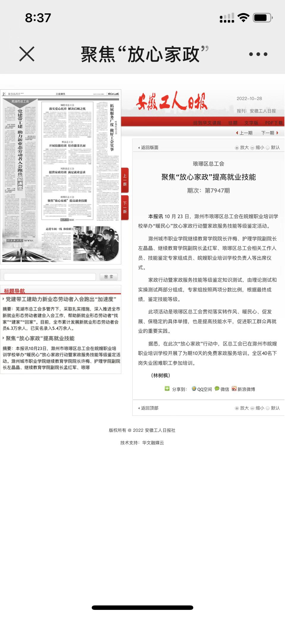 10月23日,我校与琅琊区总工会联合举办“暖民心”放心家政行动暨家政服务技能等级鉴定活动。《安徽工人日报》对此进行宣传报道: