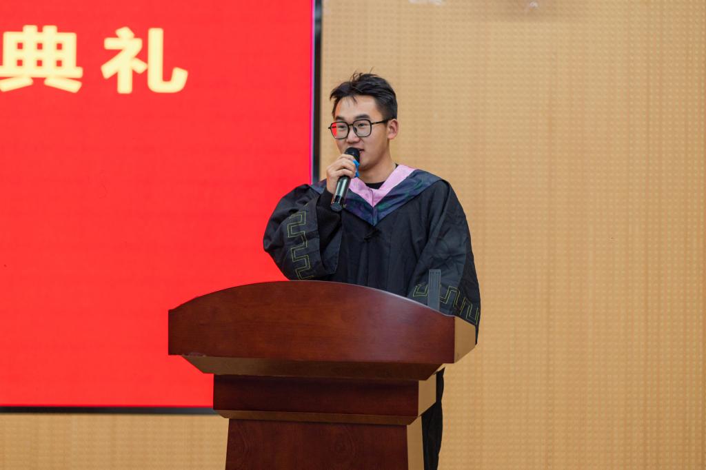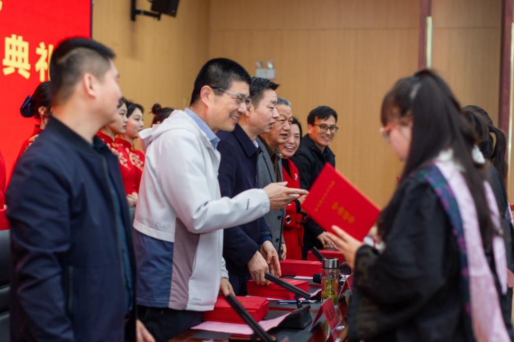 李琼琼、黄家宝两位同学代表毕业生发言,表达了对母校、对班主任及任课老师的谢意,分享了自学考试的学习经验和心得体会。班主任代表张晶晶对顺利毕业的同学们表示祝贺,希望他们以本科学历为起点,在以后的工作和生活中取得更耀眼的成绩。随后,施向阳宣读2023年自考本科毕业证书颁发名单,并由与会领导现场颁发毕业证书。