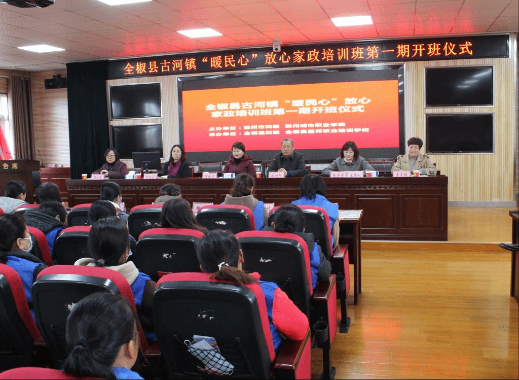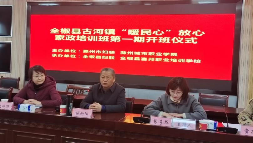 3月23日,我校与市妇联联合开展的“暖民心”放心家政系列培训活动第一期在全椒县古河镇正式开班。校党委委员施向阳、滁州市妇联党组成员、副主席吴晓丽、全椒县妇联党组书记、主席张奇华、古河镇镇长郭友莉等领导出席开班启动仪式。