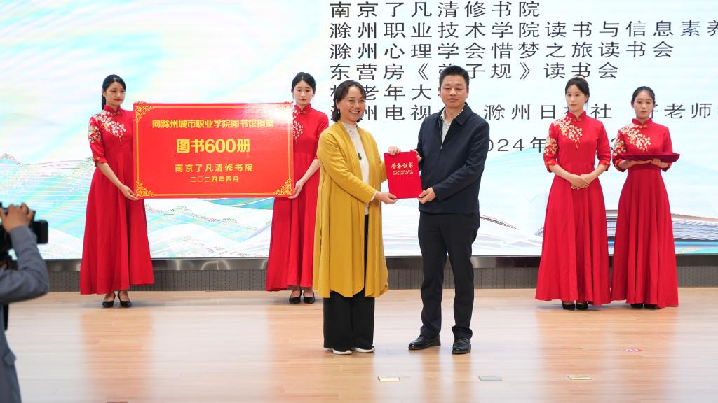 活动开始,首先举行图书捐赠仪式。南京了凡清修书院一直致力于传播中华优秀传统文化,助力中华民族伟大复兴的光荣使命,借世界读书日之际,书院再次向我校捐赠600本图书。汪上代表学校接受捐赠,并给南京了凡清修书院颁发捐赠荣誉证书。