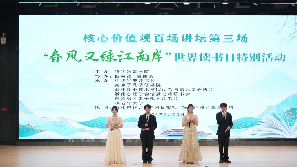 读书尚学,是中华民族的优良传统。为进一步弘扬社会主义核心价值观,培养更多的“向上向善”中华好青年,营造浓厚读书氛围,助推书香校园建设,贯彻落实“三全育人”理念,4月23日,在第29个世界读书日来临之际,我校中华经典读书会携手南京了凡清修书院、滁州职业技术学院读书与信息素养协会、滁州心理学会惜梦之旅读书会、东营房《弟子规》读书会、校老年大学联合举办“春风又绿江南岸”世界读书日特别活动。校党委副书记、校长汪上,图书馆馆长陈素霞,继续教育学院院长、中华经典读书会指导老师许梅,南京了凡清修书院创办人、院长经仕凤及学生代表近400人参加活动。