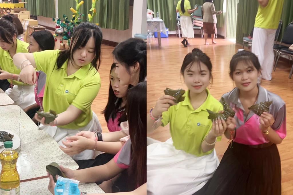 在随后的交流行程中,我校学生到Ban Hao Hug Hean Hu natural way nursery Mahasarakham幼儿园交流学习,与幼儿园小朋友亲切互动,丰富了一线幼儿教学实习经验。交流期间,我校学生还参与了泰国玛莎拉堪皇家大学组织的泰国传统服饰体验活动。端午节当天,我校学生与泰国学生齐聚一堂,一起折粽叶、填糯米、裹粽叶。我校学生代表还向玛莎拉堪皇家大学师生介绍了端午节起源、风俗和粽子的寓意等传统文化知识,让泰国师生感受到中华传统文化的魅力,进一步夯实了我校青年学生的文化自信,厚植了中华文化的情怀。