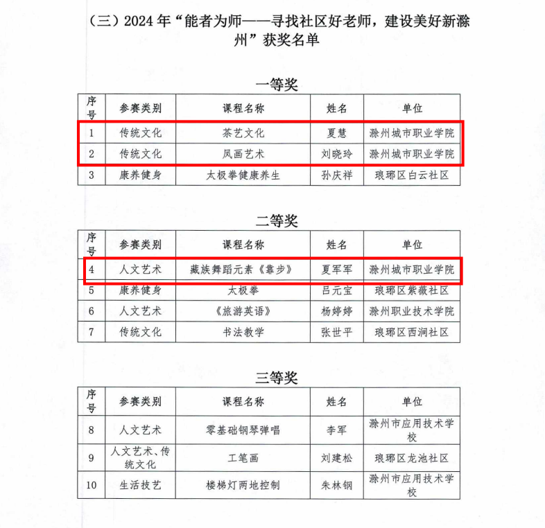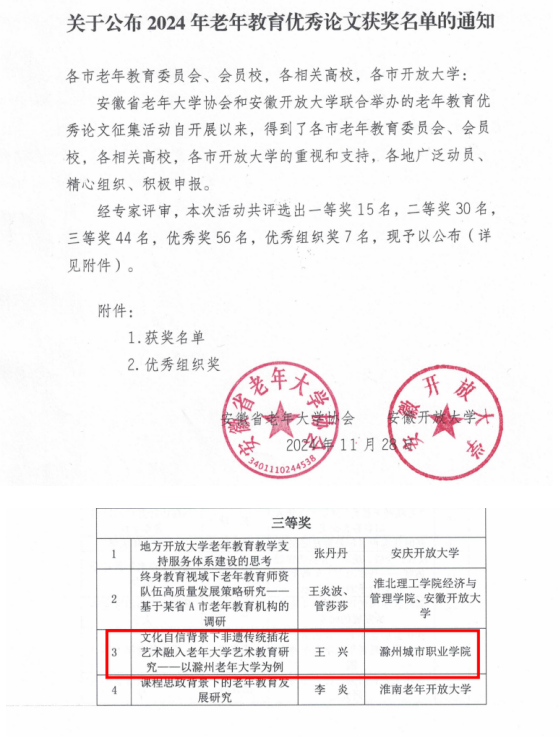 近日,在安徽省老年大学协会和安徽开放大学联合举办的“2024年老年教育优秀论文”评选活动中,我校老年大学教师王兴的论文《文化自信背景下非遗传统插花艺术融入老年大学艺术教育研究—--以滁州老年大学为例》荣获三等奖;在滁州市教体局2024年“能者为师——寻找社区好老师,建设美好新滁州”比赛中,我校老年大学任课教师刘晓玲、夏慧荣获一等奖,夏军军荣获二等奖;在滁州市教体局2024年“百姓学习之星”评选中,我校教师穆玲获评“百姓学习之星”荣誉称号。这一成绩的取得,充分展示了我校教师的专业素养和教学能力,同时也体现了我校在培养高素质老年教育师资方面的显著成效。期待我校教师能够继续发挥专业优势,为推动老年教育事业的高质量发展做出更大贡献。