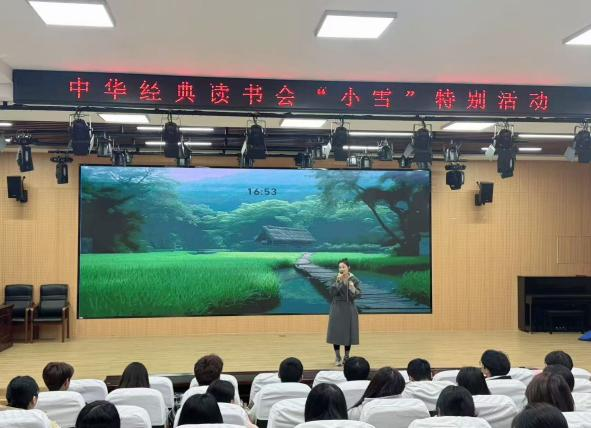 活动最后,在指导老师顾雪光带领下,同学们齐声诵读了马克思主义学院“三全育人”读本《经典诵读汇编》中的《沁园春·长沙》《满江红》等经典名作。朗朗书声回荡在报告厅内,彰显出同学们对经典文化的热爱。此次活动不仅为同学们提供了学习经典文化的宝贵机会,更在小雪这一特殊节气里,进一步促进了校园文化建设与经典文化传承。