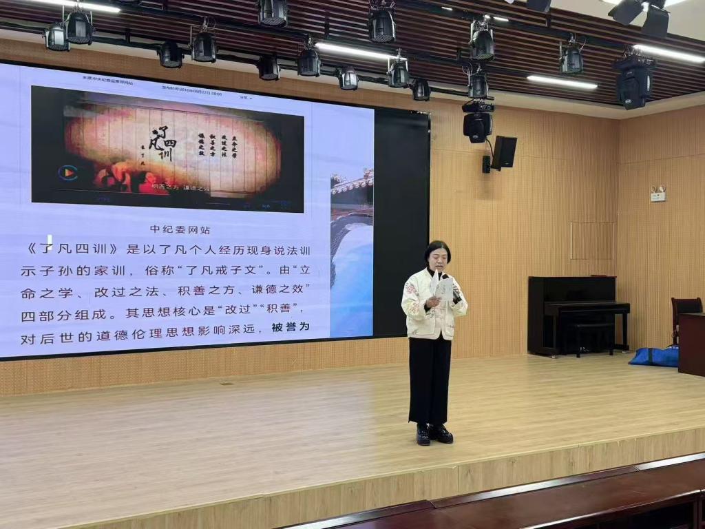 活动开场,许梅老师详细阐释了中华经典读书会的创办缘由和发展经历,使在场同学对其成立背景有了一个更加清晰的认知。随后,许梅老师以中纪委网站推荐的中国家教经典书籍《了凡四训》部分章节展开讲解,解读了书中关于“改过之法”“谦德之效”的精髓要义,让同学们沉浸于优秀传统文化的经典智慧之中。