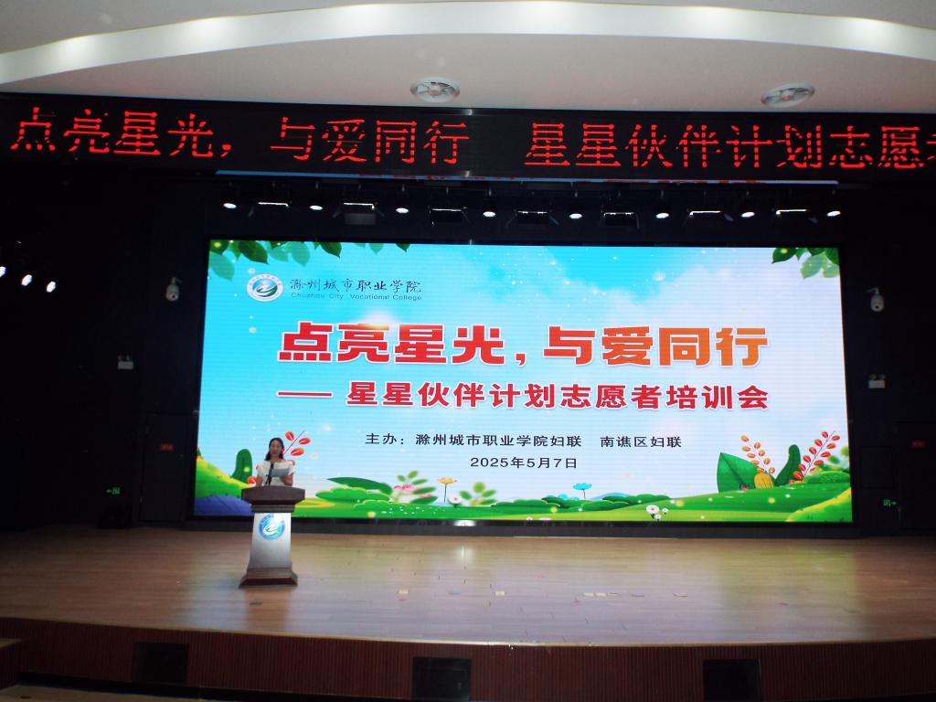 为弘扬志愿服务精神,提升志愿者服务特殊儿童群体的专业能力,5月7日下午,由校妇联与南谯区妇联联合主办的“点亮星光 与爱同行”星星伙伴计划志愿者培训会在管理与信息学院报告厅顺利举办。南谯区妇联主席王淑青、副主席梅红和校学生处副处长、校妇联副主席田青青出席了培训会,培训会由校妇联副主席李磊主持。培训会上来自各学院的600余名师生志愿者齐聚一堂,系统学习特殊儿童陪伴技巧,为即将开展的“星星伙伴计划”志愿服务项目夯实专业基础。