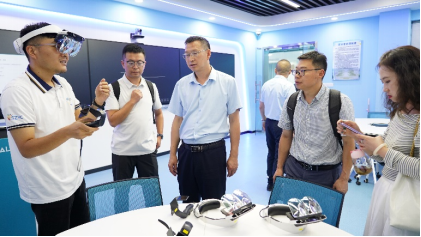 桂祥友一行先后参观了沉浸式虚拟仿真实训室、学前教育MR实训室、桌面式虚拟仿真实训室、虚拟仿真体验中心等4个区域,详细了解了我院利用VR/MR技术定制研发的智慧托育和亲子活动实训场景,并沉浸体验了两门虚拟仿真课程定制资源。数智研创团队的工作人员对基地的建设思路和建设特色进行了详细的介绍,并现场演示了基于MR技术开发的智慧托育课程资源。