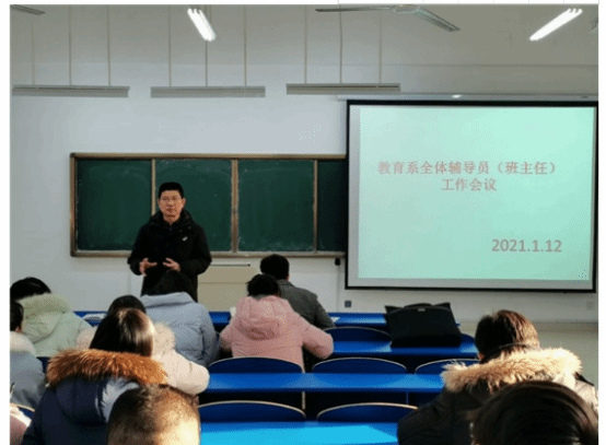 1月12日下午4点20分,教育系于C1南1103召开全体辅导员(班主任)工作会议。党总支书记钱庆兵、学管秘书杨维懂、团总支书记黄正顺及全体辅导员班主任参加会议,此次会议由党总支书记钱庆兵主持。