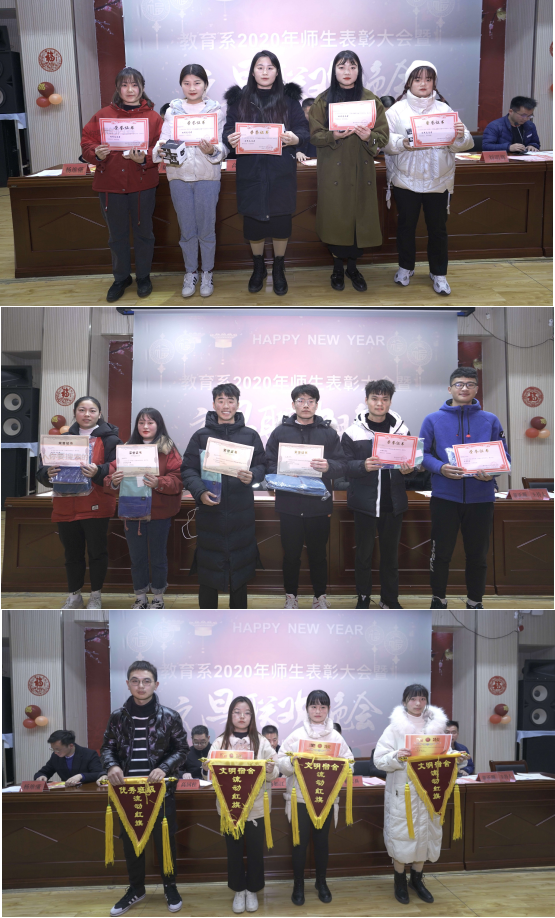 会上,杨如江宣读了2020年度师德师风演讲比赛、优秀学生干部、优秀团支书、先进团支部、优秀志愿者、优雅寝室、文明教室、趣味运动会、体育比赛获以及科技文化艺术节获奖代表名单。在欢快的背景音乐声中,与会领导为本次受表彰的集体和个人颁奖。