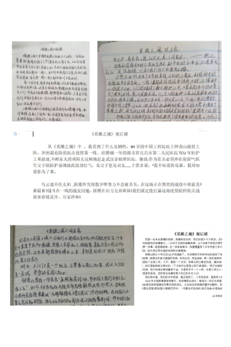 2020年,新型冠状病毒侵袭,形势严峻,举国抗疫,多少可歌可泣的英雄事迹让人泪目。同学们观看由新华社制作的抗“疫”全景纪录片《英雄之城》,学习在抗击疫情过程中涌现出先进人物的事迹。在观看之后,同学们纷纷写出自己的感悟:“向最美逆行者致敬!”“没有哪个冬天不可逾越 没有哪个春天不会来临”“那有什么岁月静好 不过是有人替我们负重前行”“疫情击不垮我们 只会让我们的民族变得更加团结”……