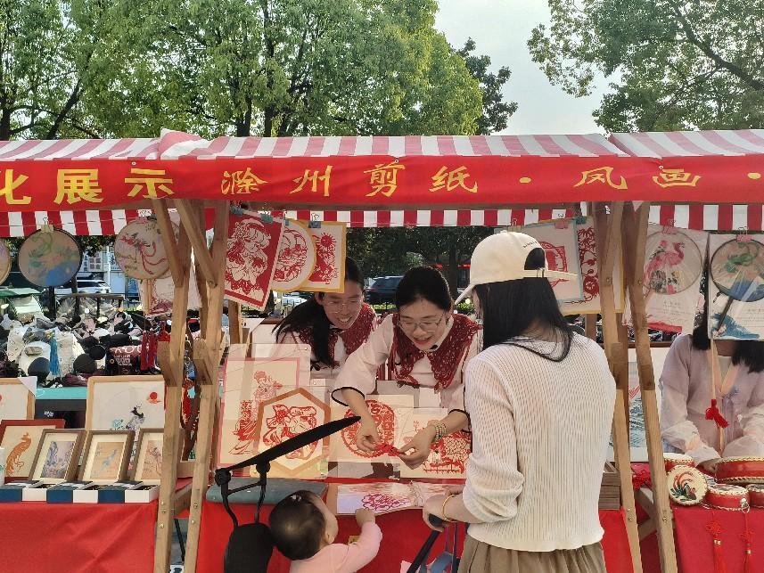 5月10日晚,由南谯区新时代文明实践中心、区委宣传部、区委政法委及银花街道办事处主办的南谯区“谯梁夜市”双提升专场在万达广场正式开幕,教育学院非遗剪纸工作坊受邀参展,校内负责人黄红艳、王静及校外指导专家陈海珍作现场指导。