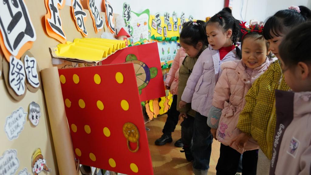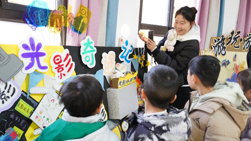活动期间,教育学院精心挑选了多件在大赛中脱颖而出的作品,送至名儒园幼儿园艺境山城分园进行展示。参与创作的学生摇身一变成为“小老师”,热情地为小朋友们讲解作品内涵。在幼儿园里,小朋友们被精美绝伦的环创作品深深吸引,围聚在作品周围,眼中满是好奇与兴奋。面对“游玩 游皖”,他们纷纷指着景点向学生“老师”提问,在互动中增长见识;在科普展区,更是积极参与互动游戏,小手不停地触摸模型、转动关节,沉浸在知识探索的欢乐中。