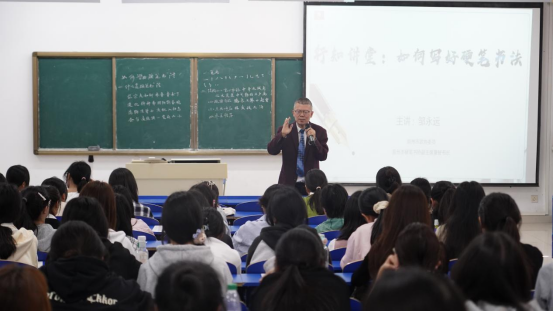 邹永远用通俗易懂的语言,深入浅出地阐述了什么是硬笔书法,他指出,硬笔书法不仅是一种书写形式,更是一种艺术表达,承载着深厚的文化内涵。随后,他通过作品展示、现场示范等方式,详细地阐述了不同笔画的书写要点,通过现场示范,同学们直观地感受到了笔画的美感和力度。最后,邹永远从重心平稳、疏密匀称、点画呼应、参差错落四个方面对书写结构进行了深入浅出的阐述,他指出,硬笔书法书写要遵循一定的规范,也要注重增加字体的灵动性,让字体更具有艺术魅力。