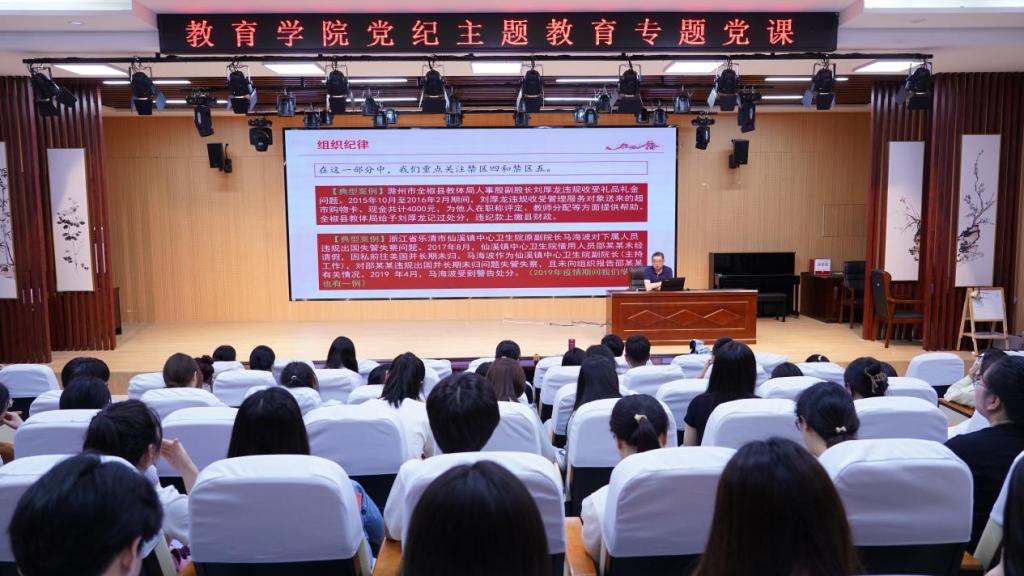为推进党纪学习教育走深走实,增强学院师生的纪律规矩意识,6月5日下午,校党委委员、教育学院党总支书记高国柱在教育学院报告厅作题为《牢记党规党纪争做合格党员》的专题党课,教育学院120余名入党积极分子及党员教师参加。