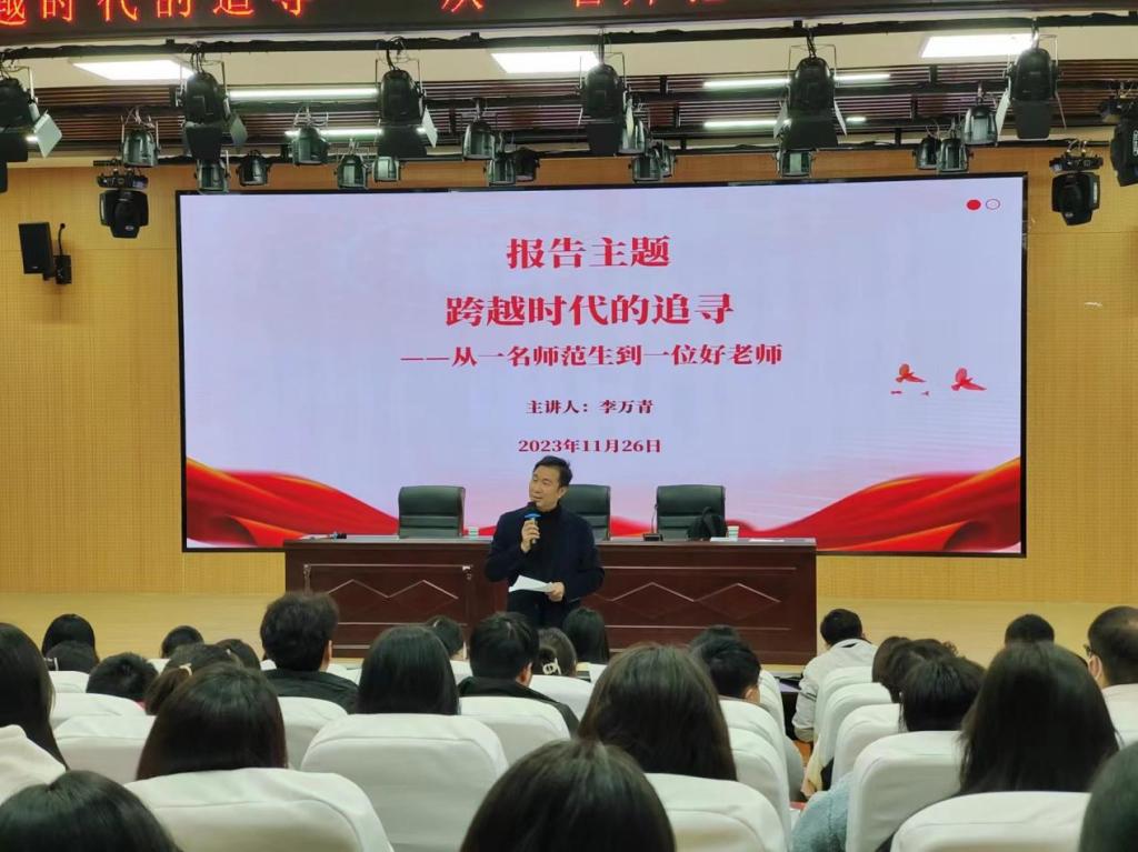 2023年11月26日下午,原凤阳师范学校94届知名校友、南京朝天宫小学校长李万青为教育学院小学教学专业的毕业生们做了一场题为《跨越时代的追寻——从一个师范生到一个好老师》的讲座。这场讲座吸引了该专业的近150名学生及部分教师参加。