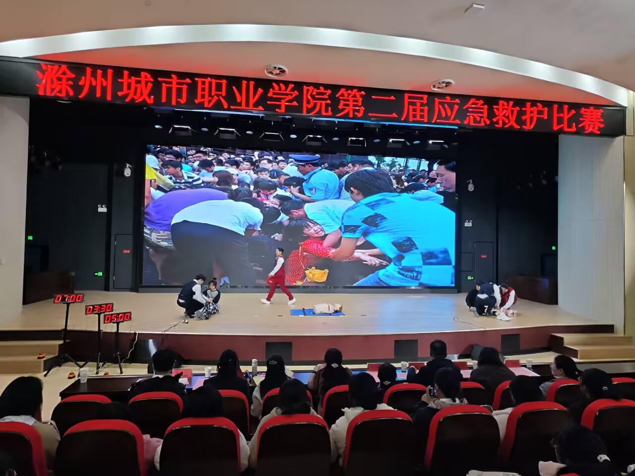 比赛分情景模拟演练和评委提问两个环节,考验选手临场评估伤情、观察情况与救护操作的能力。7分钟倒计时开始,每队4名队员同时操作场景题中的不同急救项目内容,现场气氛紧张又激烈,我院选手们有条不紊,以严谨的态度、娴熟的操作技能应对比赛,体现了抢救伤员过程中分秒必争的态度。