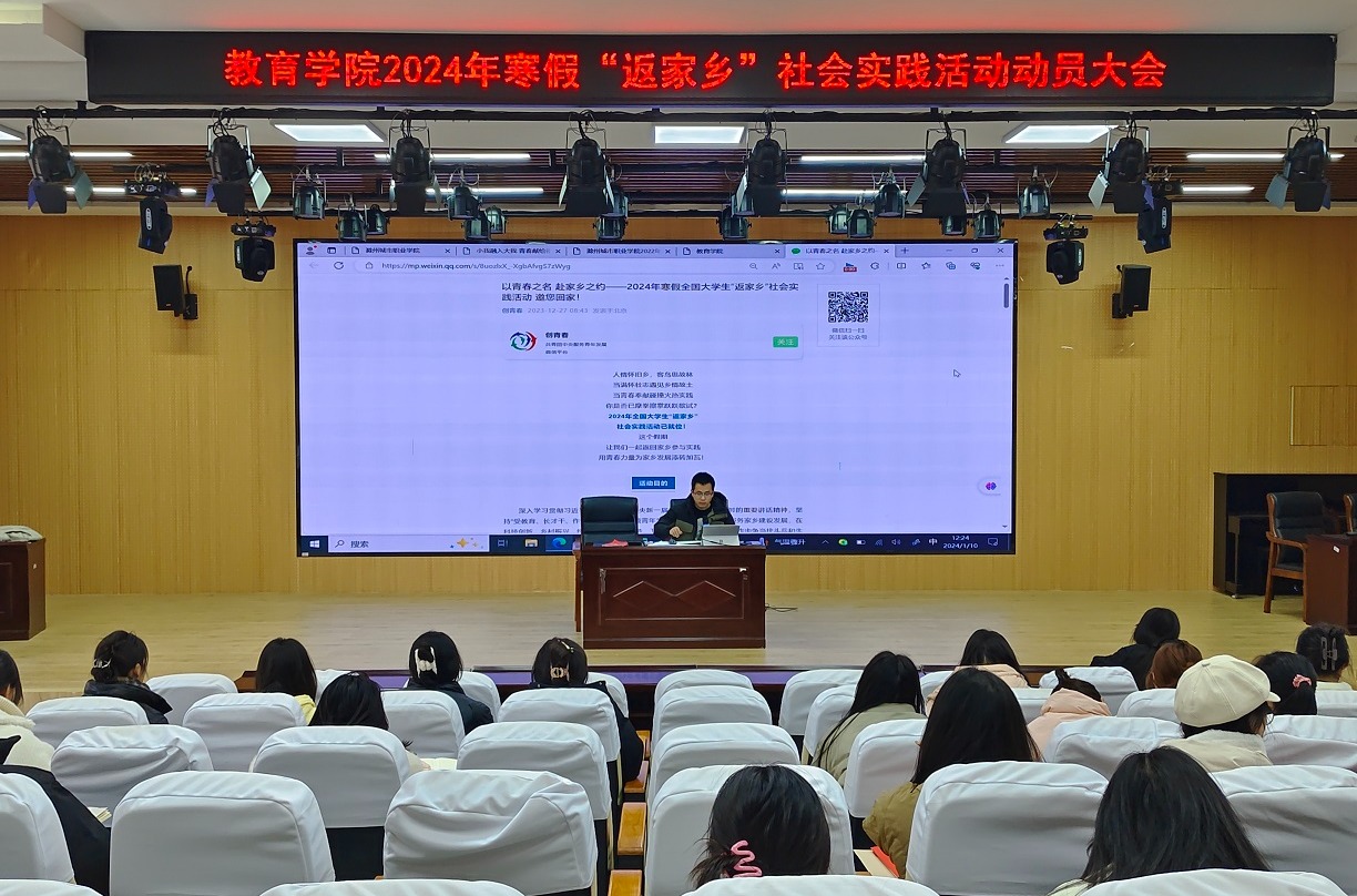 为深入学习贯彻习近平总书记在同团中央新一届领导班子集体谈话时的重要讲话精神,坚持“受教育、长才干、作贡献”的宗旨,引领青年学子返回家乡参与实践服务家乡建设发展,1月10日,教育学院团总支在学院报告厅召开2024年寒假“返家乡”社会实践动员大会,团总支委员、全体在校班级团支书参加动员会,动员会由团总支书记黄正顺主持。
