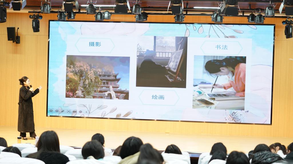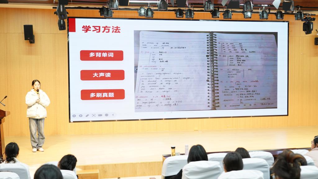 在分享环节,童慧、周紫璐、王慧等六位国家奖学金获得者依次走上讲台,毫无保留地分享她们的成功经验。在学习方法上,他们有的擅长构建知识网络,将书本知识融会贯通;有的则通过错题整理、定期回顾,不断夯实基础,提升学习效果。谈及学科竞赛,同学们分享了从团队组建到项目执行的全过程,强调个人努力付出与团队协作的重要性,鼓励大家勇敢挑战自我,突破知识边界。社会实践方面,他们讲述了参与社会实践、三下乡等活动的深刻感悟,展示如何将理论知识应用于实际,在服务社会中实现个人价值。