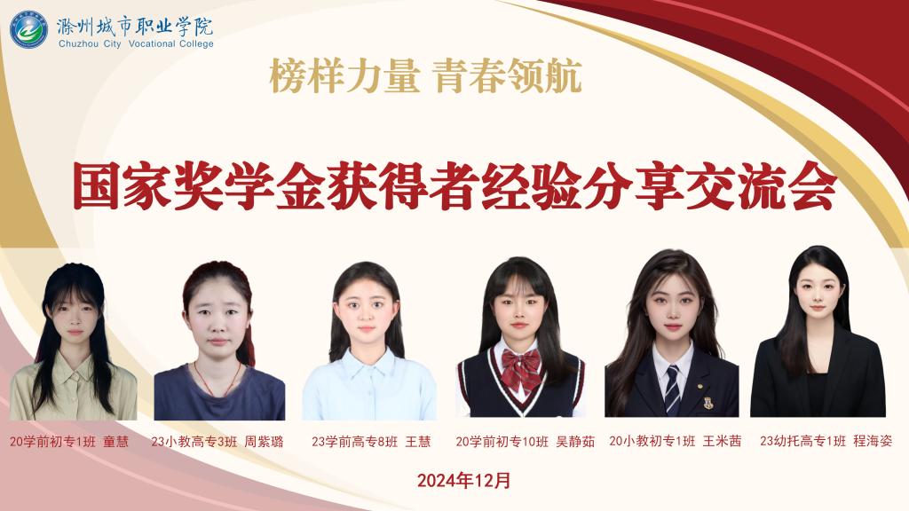 为充分发挥优秀学生的榜样引领作用,激发学生的学习热情与进取精神,营造浓厚的学习氛围,教育学院于12月18日在学院报告厅举行了“行知青年说”2024年国家奖学金经验分享会。此次分享会邀请了国家奖学金获得者童慧、周紫璐、王慧、吴静茹、王米茜和程海姿六位同学,分享她们在学习、学科竞赛与社会实践等方面的宝贵经验。