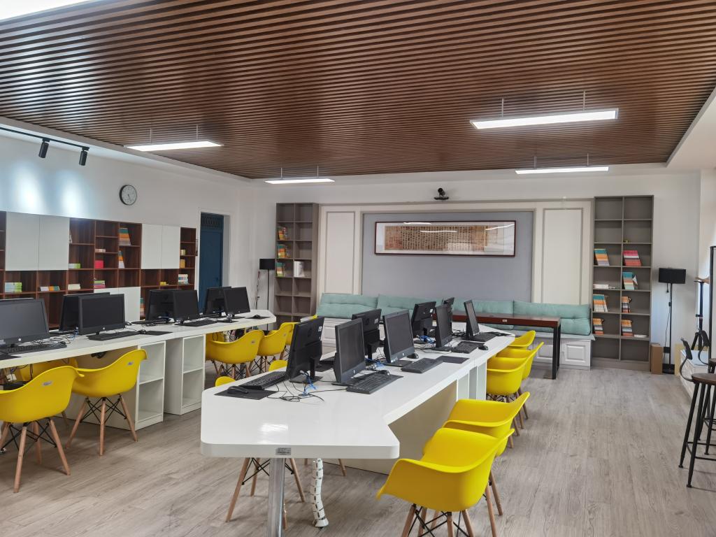 智慧教室是融合教育研讨和实操训练为一体的多功能实训室。2019年10月份开始建设,2020年3月投入使用。实训室总总面积120平方,硬件设备总投入45万元,软件投入50万元。实训室由两个功能区组成。前区是标准的48人位的智慧研讨区,6个小组讨论区,每组配备3台笔记本电脑和一个交互式大屏幕。后区为小型幼儿园仿真实训区。实训室配备远程教学系统、一体机、多媒体系统和录播系统等现代信息化设备。实训室主要承担小学教育、学前教育专业和早期教育专业的教学、教师教学能力大赛和学生技能竞赛任务。智慧教室旨在为教学活动提供人性化、智能化的互动空间;通过物理空间与数字空间的结合,本地与远程的结合,改善人与学习环境的关系,促进学生个性化学习、开放式学习和泛在学习。目前实训室的使用率较高,实训开课率达70%以上,自建成以来累计服务师生2700余人次,其中包括2020和2021年度教师教学能力大赛,以及三个专业学生学生技能竞赛训练和模拟考试等任务。