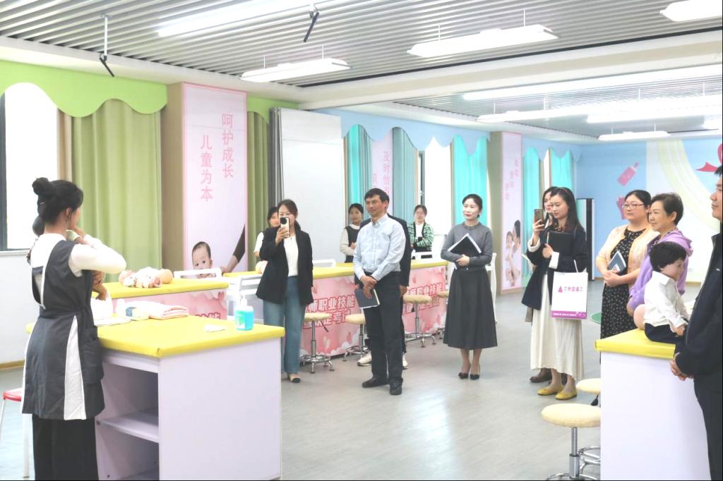 在实地考察环节,来访嘉宾先后参观了非遗剪纸艺术展、智慧婴幼儿照护实训室、凤阳花鼓技能研习坊、智慧托幼MR虚拟仿真实训基地、生命科学馆等特色教学场所。学校先进的办学设施、鲜明的专业特色和丰硕的育人成果获得了考察团的高度赞赏。