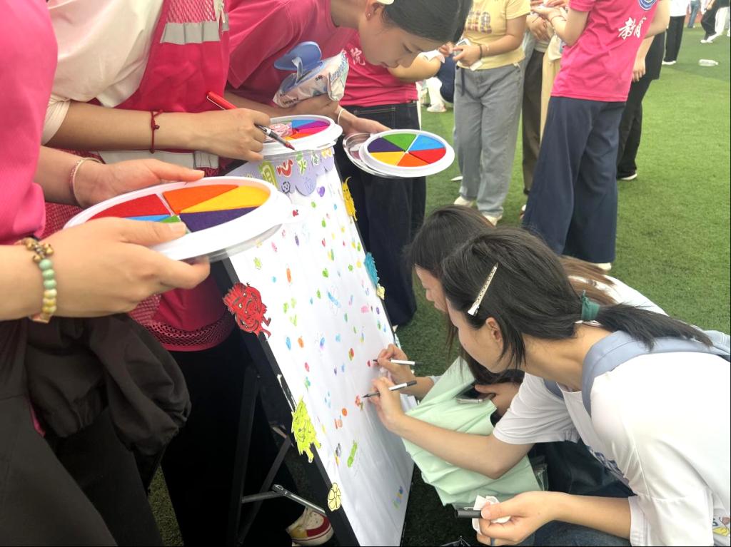 本次嘉年华设置了情绪管理、人际互动、自我接纳、压力释放四个特色心理互动区域,让同学们在轻松愉快的氛围中释放压力、收获快乐。“印泥涂鸦·情绪的色彩”让同学们用手指蘸取彩色印泥,在画布上自由创作,将内心的情绪转化为斑斓的图案。一幅幅充满个性的涂鸦作品,不仅展现了同学们的创造力,也成为情感表达的独特方式。“你笑起来真好看!”“你的坚持让我敬佩!”……在赞美卡书写区,同学们为朋友、同学甚至陌生人写下真诚的鼓励。一张张卡片承载着善意,让收到的人倍感温暖。