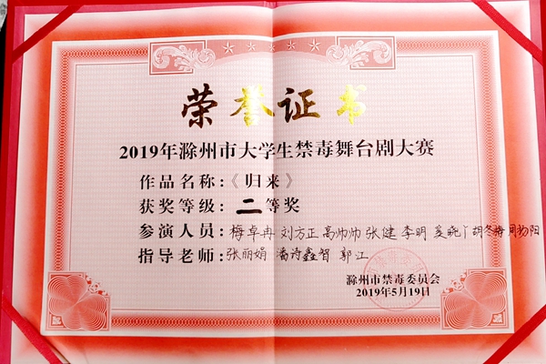 5月19日下午,“无毒青春•健康人生”2019年滁州市大学生禁毒舞台剧大赛在滁州学院水上报告厅举行。本次大赛由滁州市禁毒委员会办公室、滁州市教育体育局、滁州文化和旅游局、共青团滁州市委员会共同主办。我院原创话剧作品《归来》参赛并荣获二等奖,演员刘方正同学荣获“最佳男主角”称号。