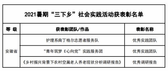 近日, 2021年安徽省大中专学生志愿者暑期社会实践活动评选结果公布公示,我校暑期“三下乡”社会实践团队、调研报告等工作获团省委表彰,解萍老师指导的《乡村振兴背景下农村空巢老人养老现状分析调研报告》获2021年全省大中专学生志愿者暑期三下乡社会实践活动优秀调研报告;由蔡季秋老师、王艳老师指导的“护理系南丁格尔志愿者服务队”,陈婷婷老师、王旭老师指导的“‘青年筑梦 E 心向党’实践服务团”获评为 2021 年全省大中专学生志愿者暑期“三下乡”社会实践活动优秀团队。
