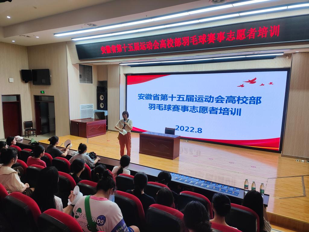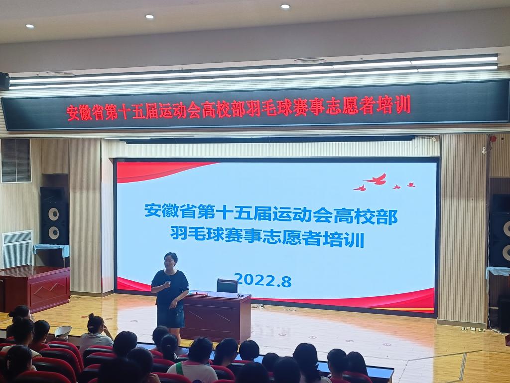 为做好安徽省第十五届运动会(以下简称“省十五运”)志愿服务保障工作,进一步提高和展示我校青年志愿者的综合素质和服务风采,8月2日下午四点,省十五运高校部羽毛球赛事志愿者专场培训在我校图文中心四楼报告厅举行。本次培训邀请了校团委书记周慧、体育部邱晓燕等两位老师主讲,服务本次赛事的近160名青年志愿者全程参加了培训。