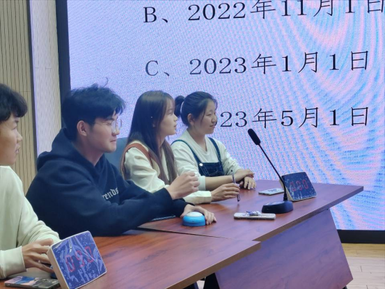 本次竞赛采用线上线下相结合的模式,最终5个学院、15名同学参加线下竞赛。竞赛共分为两个环节。第一环节为必答题,主持人进行提问,PPT展示题目,现场作答,各学院代表队将答案写在空白答题卡上,每题15秒作答时间。第二环节为抢答题,主持人将题目信息逐步念出,队伍可在此过程中进行抢答,每支队伍每题仅有一次抢答机会。答对一题得十分,答错不得分。