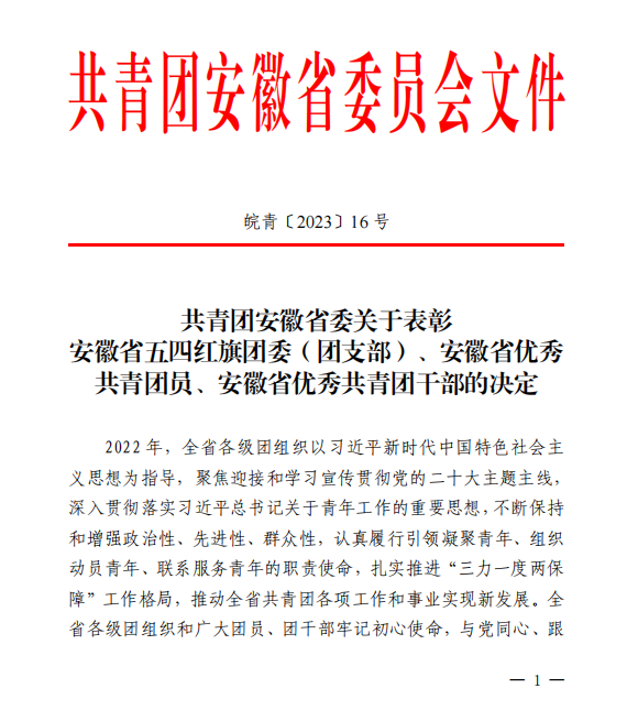 近日,共青团安徽省委发布了《关于表彰2022年度安徽省五四红旗团委(团支部)、安徽省优秀共青团员、安徽省优秀共青团干部的决定》,我校医学院团总支荣获2022年度“安徽省五四红旗团(总)支部”称号。祝贺!