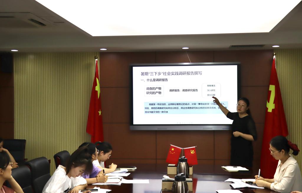 接着,校团委副书记杨静怡作调研报告撰写专题培训。杨静怡从暑期“三下乡”调研报告类型、准备工作、撰写思路等方面,详尽介绍了撰写调研报告的要求,并要求同学们在社会实践的过程中要进行科学研究调查,为撰写调研报告夯实基础。