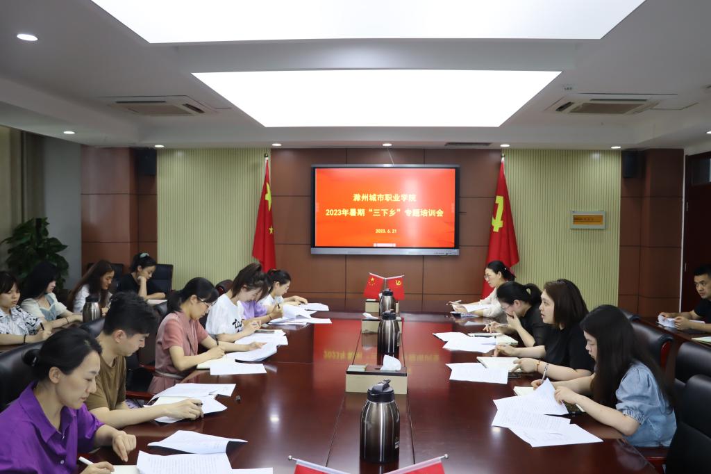 6月21日下午,我校在图文中心第四会议室举行2023年大学生志愿者暑期“三下乡”社会实践活动启动仪式暨专题培训会。会议由校团委书记陈婷婷主持。校团委全体成员、各学院团总支书记、三下乡各团队负责人、宣传员参加会议。
