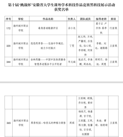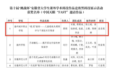 8月30日,安徽省第十届“挑战杯”大学生课外学术科技作品竞赛黑科技专项获奖名单公布,经过激烈角逐,我校报送的5个项目均获奖,实现了我校在该专项赛道零的突破!在今年6月,校团委牵头启动本届“黑科技”专项赛竞赛组织申报工作,广泛动员学生,深入挖掘项目,进行重点培育,最终推送5个项目参与省赛评选。