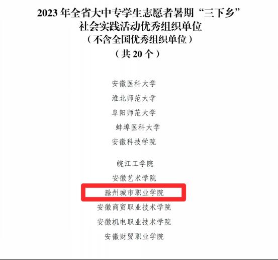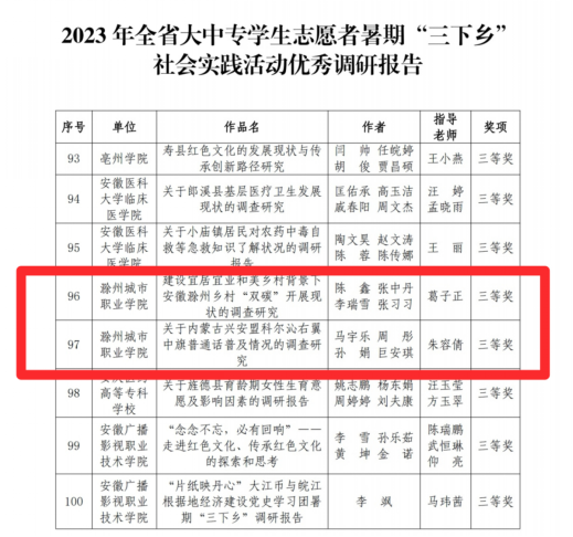近日,2023年安徽省大中专学生志愿者暑期“三下乡”社会实践活动评选结果公布,我校荣获2023年全省暑期“三下乡”社会实践活动“优秀组织单位”,2篇调研报告获得三等奖,分别是葛子正老师指导的《建设宜居宜业和美乡村背景下安徽滁州乡村“双碳”开展现状的调查》和朱容倩老师指导的《关于内蒙古兴安盟科尔沁右翼中旗普通话普及情况的调查研究》,医学院“医心向党 领航青春路”暑期社会实践队获得乡村振兴专项优秀团队。