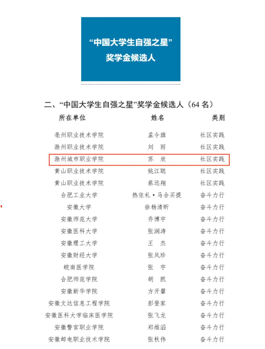 根据《2023-2024年度“安徽省大学生自强之星”奖学金推报评选工作指引》,按照爱国修德、勤学求真、创新创业、社区实践、奋斗力行5个类别,经组委会组织专家评审,共计确定90名同学为“安徽省大学生自强之星”获得者,10位同学为“安徽省大学生自强之星标兵”获得者,并择优推荐64名同学为“中国大学生自强之星”奖学金候选人,我校学子马梦月、苏欣同学荣获“安徽省大学生自强之星”,苏欣同学被推荐为“中国大学生自强之星”奖学金候选人。祝贺!